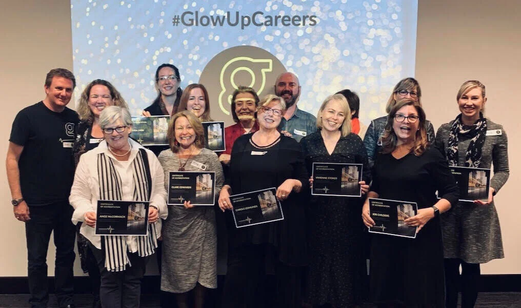 Glow Up Careers, a career coaching service, co-founded by Yvonne Kelly (second on the left, back row), with their 2019 clients. Supplied.